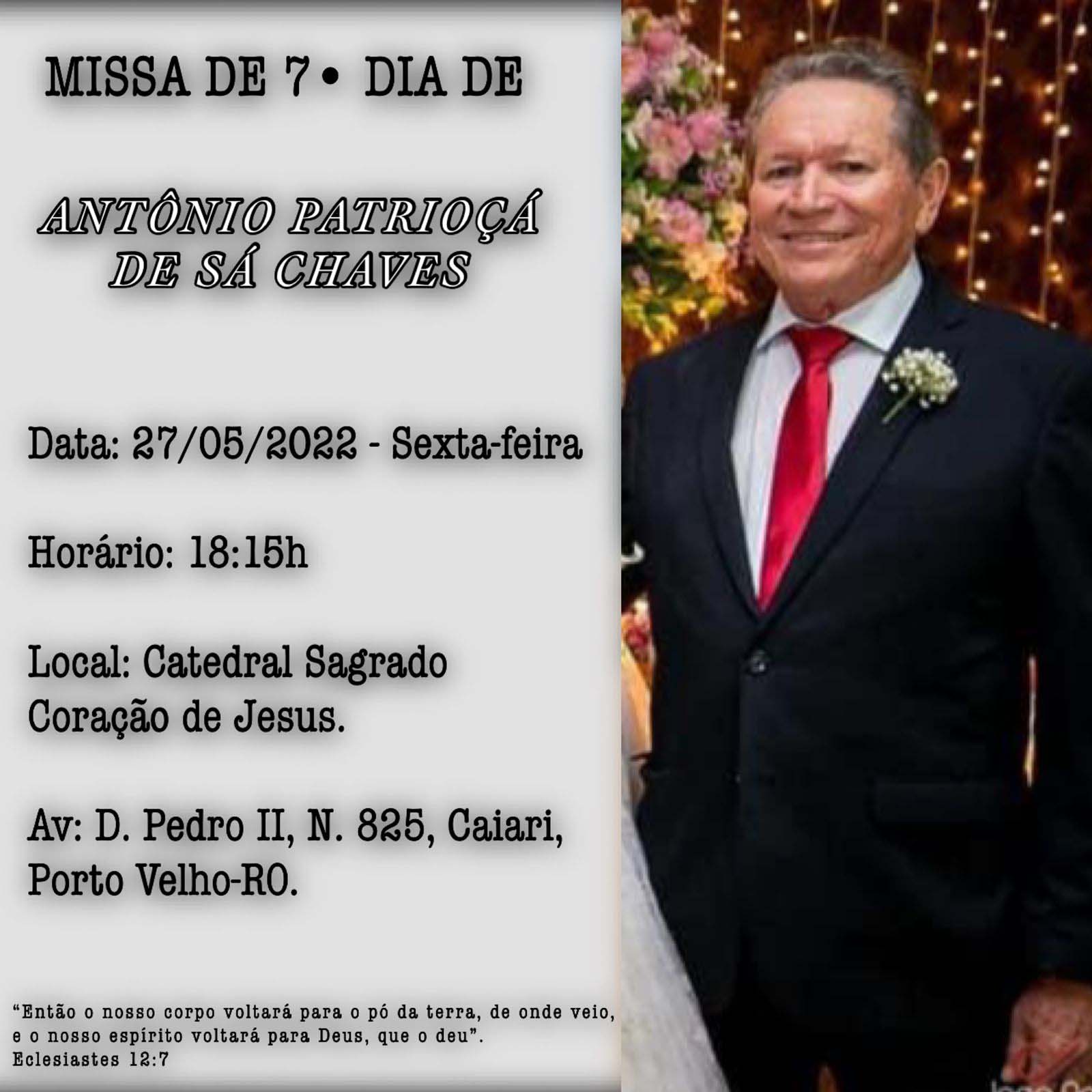 A família SÁ, em nome de seu patriarca, ARY DO CARMO GOMES DE SÁ, convida a todos para participar da Missa de Sétimo Dia de falecimento, de seu ente querido, Antônio Patrioçá de Sá Chaves, a ser realizada nesta sexta-feira, 27, às 18:15 na Catedral Sagrado Coração de Jesus, localizada na Avenida D. Pedro II, 825, bairro Caiari, em Porto Velho.