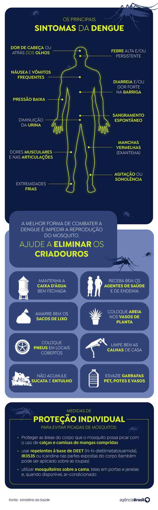 Em caso de sintomas, a orientação é procurar uma unidade de saúde e não tomar medicações por conta própria. Pessoas com doenças crônicas, gestantes, crianças menores de dois anos e idosos acima de 65 anos são mais suscetíveis a complicações provocadas por doenças transmitidas por mosquitos. Nesses casos, os cuidados devem ser redobrados.