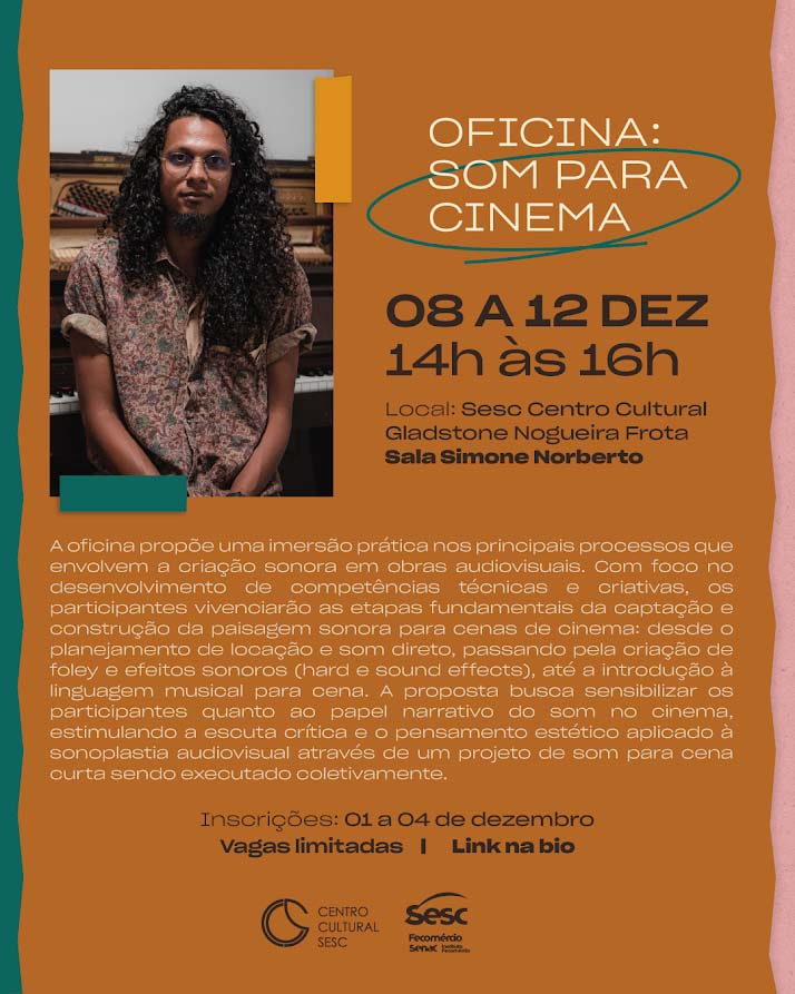 Além das telas, a Mostra investe na formação com a oficina "Som para Cinema". A atividade será ministrada por Anderson Benvindo, professor de música e diretor musical, e propõe uma imersão prática na captação, criação de foley, efeitos sonoros e linguagem musical para obras audiovisuais.