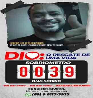 O movimento busca recuperar, inicialmente, a pessoa de Diógenes Chagas, de 40 anos de idade e usuário de drogas desde os 15 anos. Ele está internado na CLÍNICA NOVO CAMINHO em Porto Velho/RO e está sóbrio há exatos 39 dias. Testada e comprovada a eficácia do método com DIÓGENES CHAGAS, ele será expandido para outras pessoas e famílias que queiram se livrar do mesmo suplício da dependência química.