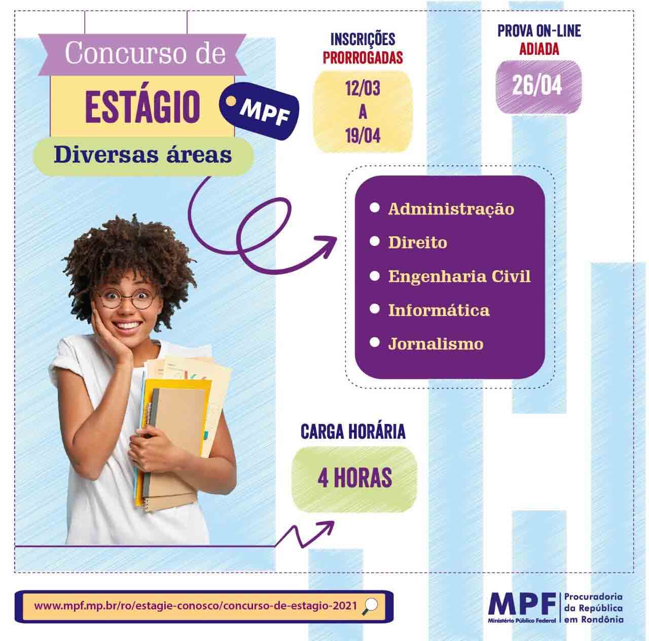 O Ministério Público Federal (MPF) alterou nesta quinta-feira (8) o edital para seleção de estagiários em cinco áreas: administração, direito, engenharia civil, jornalismo e informática. A nova data para a aplicação das provas é em 26 de abril. As inscrições iniciaram em 12 de março e vão até 19 de abril. A bolsa de estágio é de 850 reais e o auxílio-transporte é de sete reais por dia de estágio. A carga horária é de quatro horas diárias, de segunda a sexta-feira. As inscrições são gratuitas.