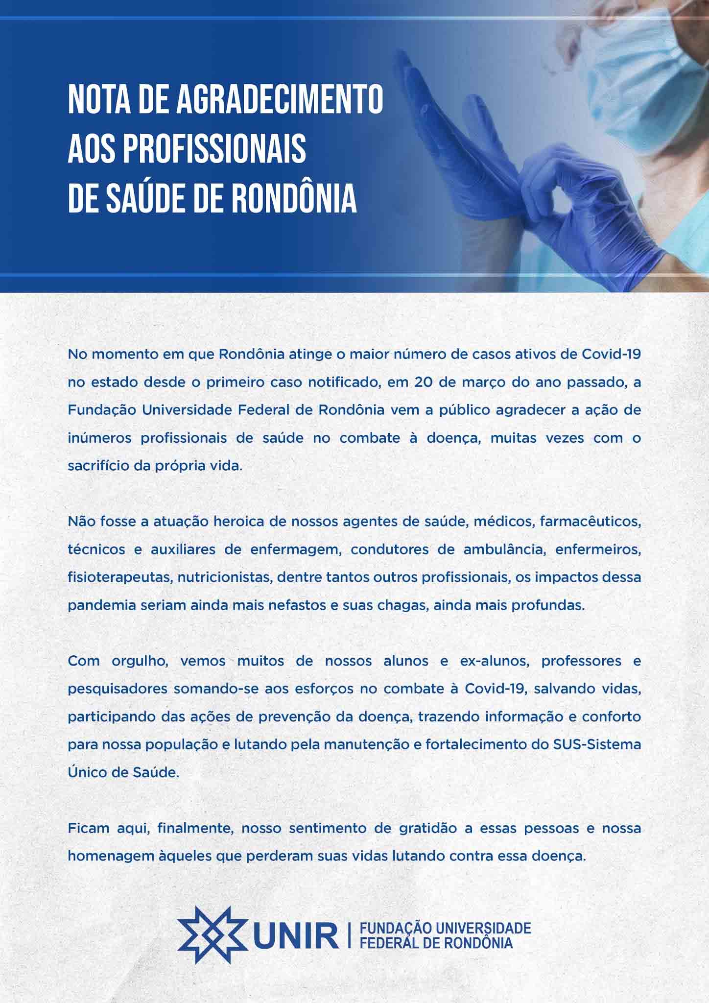 No momento em que Rondônia atinge o maior número de casos ativos de Covid-19 no estado desde o primeiro caso notificado, em 20 de março do ano passado, a Fundação Universidade Federal de Rondônia vem a público agradecer a ação de inúmeros profissionais de saúde no combate à doença, muitas vezes com o sacrifício da própria vida.