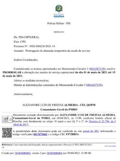 Em ato contínuo, no dia 30 de abril de 2021, o Comando da PMRO emitiu despacho administrativo no Processo SEI, prorrogando a alteração das escalas de serviço operacionais do dia 01 de maio de 2021 até 15 de maio de 2021, como tem sido de praxe dentro de prazos quinzenais. Em consequência, o Comando da PMRO continua adotando o Home Office nas escalas administrativas, respeitando a porcentagem de serviço presencial conforme a fase estipulada, bem como a manutenção do regime de escala 12h x 24h / 12h x 96h nos serviços operacionais.