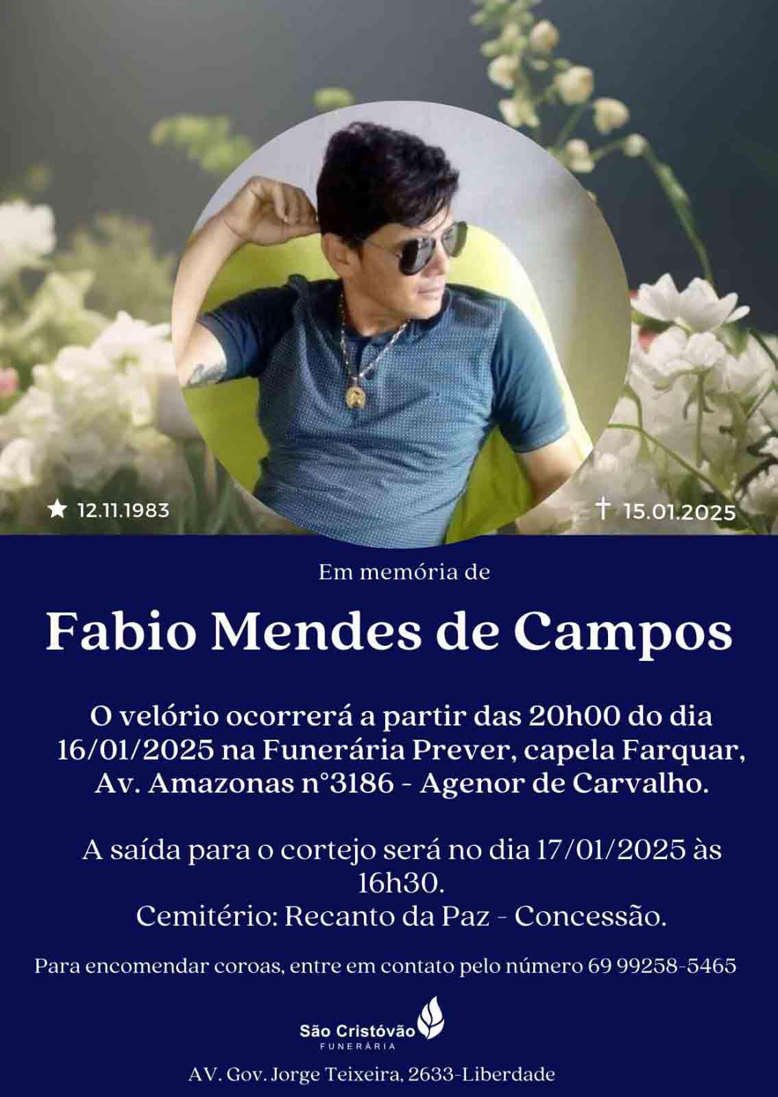 É com profundo pesar que venho manifestar meus sentimentos pela trágica morte do pedreiro Fábio Mendes de Campos, aos 41 anos, em decorrência de um ataque a tiros ocorrido na noite de ontem, 15, no bairro Ulisses Guimarães.