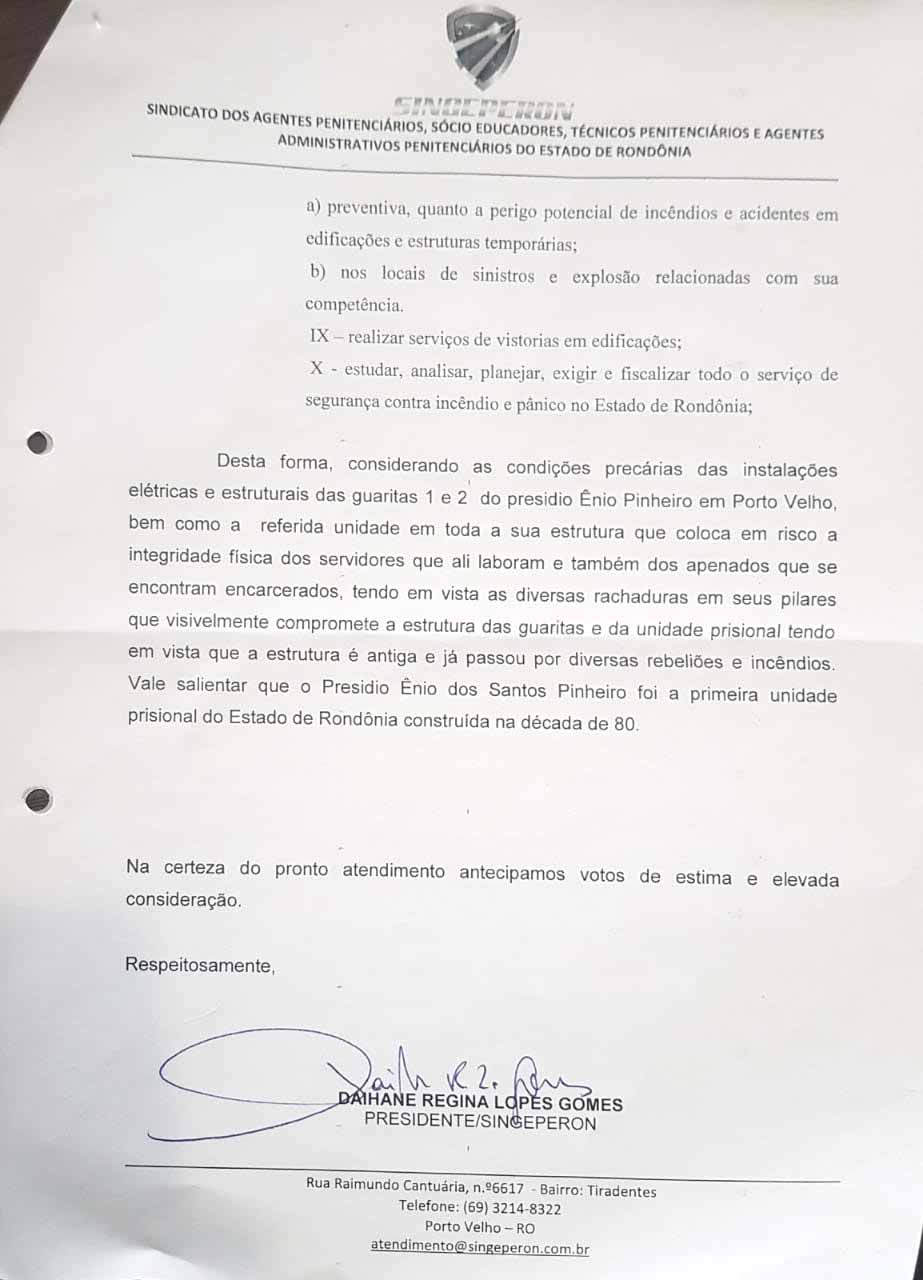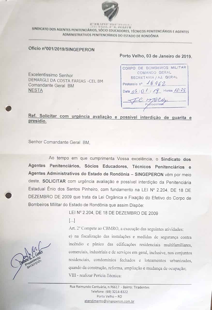 O Singeperon já havia notificado os órgãos competentes responsáveis sobre o caos e abandono do presídio, inclusive com toda sua estrutura comprometida, o Sindicato encaminhou ofícios relatando e pedindo providências do Ministério Público, Sejus e solicitou vistoria do Corpo de Bombeiros. O Singeperon também havia pedido a interdição total do presídio.
