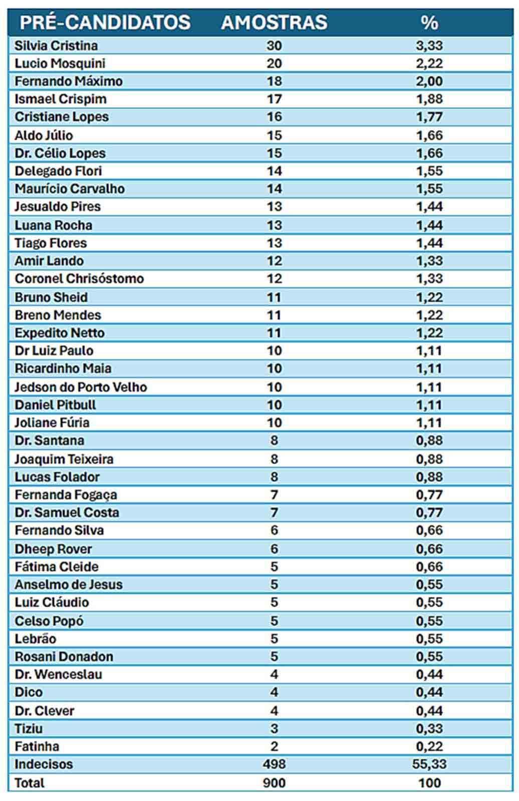 Os deputados federais Silva Cristina (3,33%), Lucio Mosquini (2,22%) e Fernando Máximo (2%); o deputado estadual Ismael Crispim (1,88%), a deputada federal Cristiane Lopes (1,77%), o prefeito de Rolim de Moura Aldo Júlio e o advogado Célio Lopes, empatados com 1,66%. Empatados na 8ª. colocação estão o prefeito de Vilhena Delegado Flori e o deputado federal Maurício Carvalho, com 1,55%.