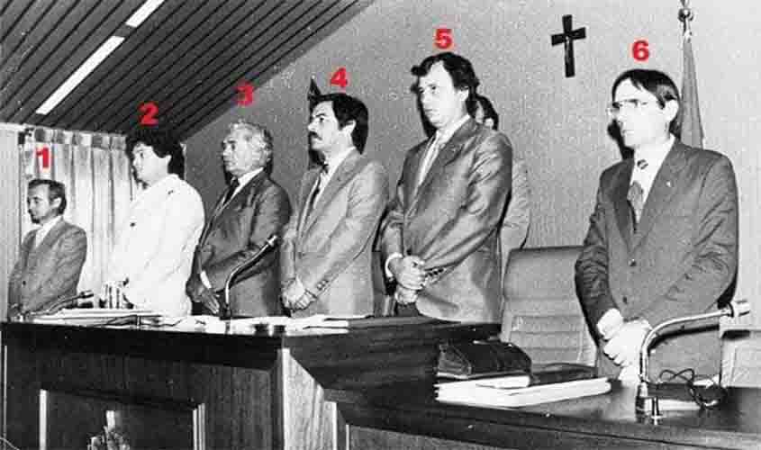 FOTO DO DIA: Primeira reunião dos deputados estaduais eleitos em 1982 e que atuarão, até à promulgação da Constituição estadual como “constituintes”, sem poder para apresentar e votar projetos de Lei. Até à promulgação o governador Jorge Teixeira conforme a Lei 41/81, que criou o Estado, continuará legislando por decreto. Com 16 deputados o PDS não teve dificuldades em eleger a Mesa Diretora da Assembleia e, inicialmente, talvez apenas para marcar posição, o PMDB, com 9, anunciou que nenhum membro faria parte, mas acabou aceitando e a Mesa ficou composta pelos deputados (esquerda para direita) Jerzy Badocha (PMDB, 4º sec), Osvaldo Piana (1º sec, PDS), Zuca Marcolino (1º vice, PDS), José Bianco (PDS Pres), Ronaldo Aragão (PMDB, 2º vice) e Angelo Angelin (PMDB2º sec). Na foto não está o deputado Walderedo Paiva (PDS, 3º sec). (F. Acervo Lúcio Albuquerque)