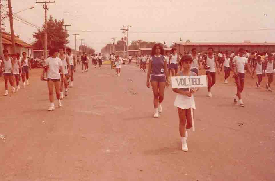 FOTO DO DIA: Porto Velho 1981 – desfile de abertura dos Jogos Escolares de Rondônia, delegação do Colégio Carmela Dutra, com sua principal representação, o Voleibol puxando o grupamento – nos dois naipes o Carmela sempre estava entre os finalistas, especialmente no masculino, onde vários dos atletas eram das seleções estaduais escolares juvenis e adultas, com títulos nacionais incluídos. O grupo desfila pela Avenida Farqhuar, debaixo de muito sol, levando seus troféus. Os Jogos Escolares, com delegações de todas cidades do então Território Federal, atraíam grande quantidade de público, com o período de competição já fazendo parte do calendário escolar, quando as aulas eram suspensas, e a imprensa dava grande destaque às disputas, com páginas inteiras ou transmissão ao vivo das partidas, especialmente de Voleibol.