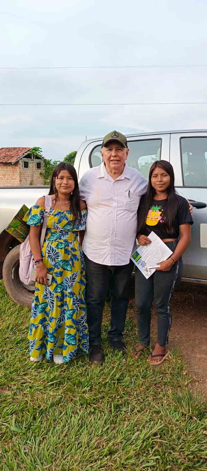 O escritor Paulo Saldanha, com alunas da escola Wen Canun Oro Waran.