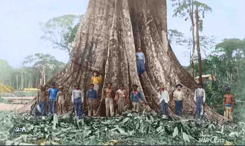 FOTO DO DIA: Uma sapopema? Uma samauma? Uma castanheira? A qualificação não vem ao caso, porque qualquer que seja sua identificação a imensa árvore captada pela lente do fotógrafo Dana de Merrril, que documentou a construção da Estrada de Ferro Madeira-Mamoré, passa a qualquer um, ao fazer uma comparação entre a grandiosidade desse exemplar e os homens que se ajeitam a sua volta, sobre a pequenez dos seres humanos que invadiram a floresta e, ao mesmo tempo, o gigantismo de seres como desse tipo de árvore, na imensidão da floresta amazônica, fazendo com que esses trabalhadores mais pareçam um grupo de pigmeus. Derrubar uma imensidão de árvore como essa aí certamente não deve ter sido com uso de machados e serras, mas, sim, com dinamite. A colorização foi feita pelo designer Luís Claro.