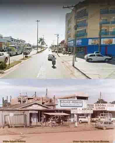 FOTO DO DIA: Duas fotos, dois momentos. Na foto de cima, a atual avenida Marechal Rondon, um grande centro comercial e de serviços no município de Ji-Paraná, pista dupla, calçadas largas, passagem obrigatória para quem demanda a cidade vindo pela BR-364 da região de Jaru e quer fugir do tráfego da rodovia. Na foto de baixo, com era aquela via em 1989, quando pequenos estabelecimentos comerciais se mantinham pela crença de que era precioso acreditar perseverar, como muitos que vieram para o Território e provaram que, apesar de todas afirmações em contrário, como na carta de Caminha a El-Rei comunicando o descobrimento do Brasil, o solo da Amazônia, especialmente de Rondônia, era próprio para a agricultura. A obra da avenida, aconteceu, conforme o ex-senador Alcides Paio à época em que era vice-governador do Estado o advogado Orestes Muniz.