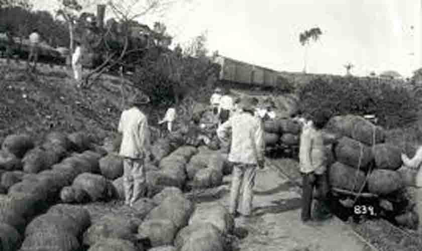 FOTO DO DIA: O engenheiro Joaquim Catramby foi selecionado, por licitação realizada pelo Ministério da Viação e Obras Públicas, como vencedor do edital para a construção da Estrada de Ferro Madeira-Mamoré, compromisso brasileiro no Tratado de Petrópolis assinado com a Bolívia, em que o Brasil comprou o Acre. O contrato de construção foi autorizado pelo Decreto Nº 6.103, de 7 de agosto de 1906, mas quatro meses depois, em novembro, anunciou-se que Catramby vendera o contrato ao megaempresário norte-americano Percival Farqhuar, que já vinha investindo em diversas obras estruturais no país, e com obras também nos Estados Unidos e América Central. O valor pago por Farqhuar a Catramby foi de 60 mil dólares (valor da época). A ferrovia, concluída em 1912, tinha como principal importância dar à Bolívia um canal para a exportação de seus produtos, especialmente a borracha – foto num ponto qualquer da estrada de ferro, o trem está parado para que a borracha possa ser embarcada.
