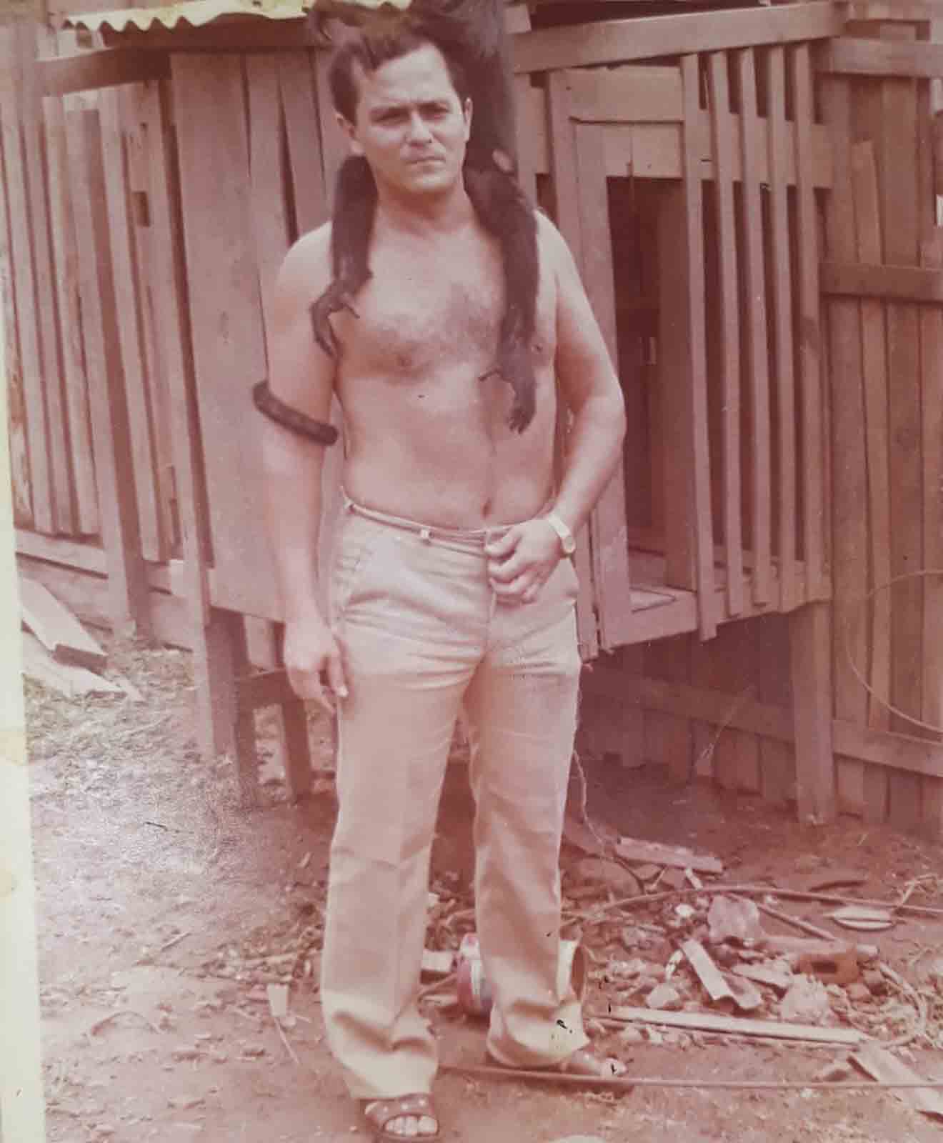 Foto no quintal de casa: Tínhamos um macaco, o “King”. Ele costumava sentar em meus ombros e passear. Uma das filhas fotografou. A legenda explica quem é quem: “O de baixo é o papai”.