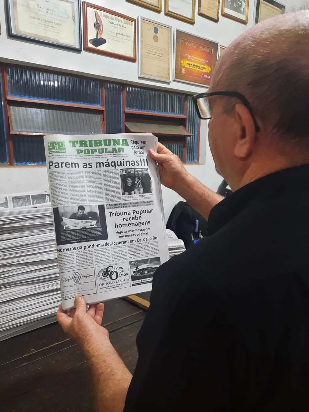 Foto: Perin observa a última edição do “Tribuna de Cacoal” (*) https://tribunapopular.com.br/nossa-historia/#:~:text=A%20hist%C3%B3ria%20do%20jornal%20Tribuna,para%20o%20Estado%20de%20Rond%C3%B4nia.