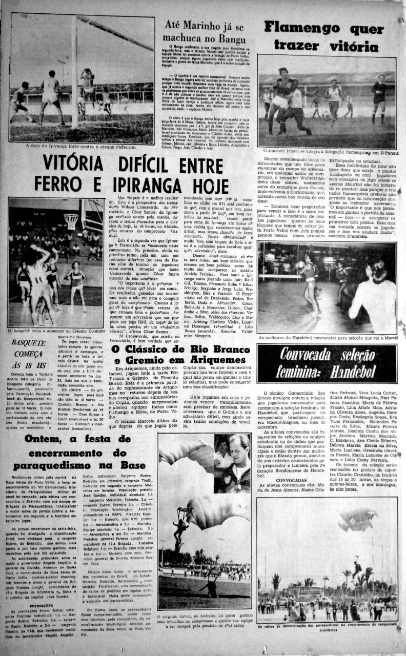FOTO DO DIA: Jornal Alto Madeira, domingo (11) e 2ª (12) de agosto 1985: O AM com dois jornalistas esportivos (João Tavares e Carlinhos Neves) noticiando o que de importante havia no esporte local, anunciando o fim da apresentação de uma equipe de paraquedistas, o início do torneio de basquete, a convocação da seleção de handebol feminino, comandada pelo treinador Gumercindo dos Santos, visando o brasileiro em Maceió. Além disso, o futebol, com a contusão do jogador Marinho, do Bangu, que ficou fora da excursão a Rondônia; um clássico local “imprevisível” entre Ypiranga e Ferroviário; a ida do Flamengo portovelhense para jogar em Cacoal contra o Corintians local e, ainda, notícia de Grêmio (Cacoal) x Rio Branco, em Ariquemes, esses três jogos pelo campeonato profissional estadual.