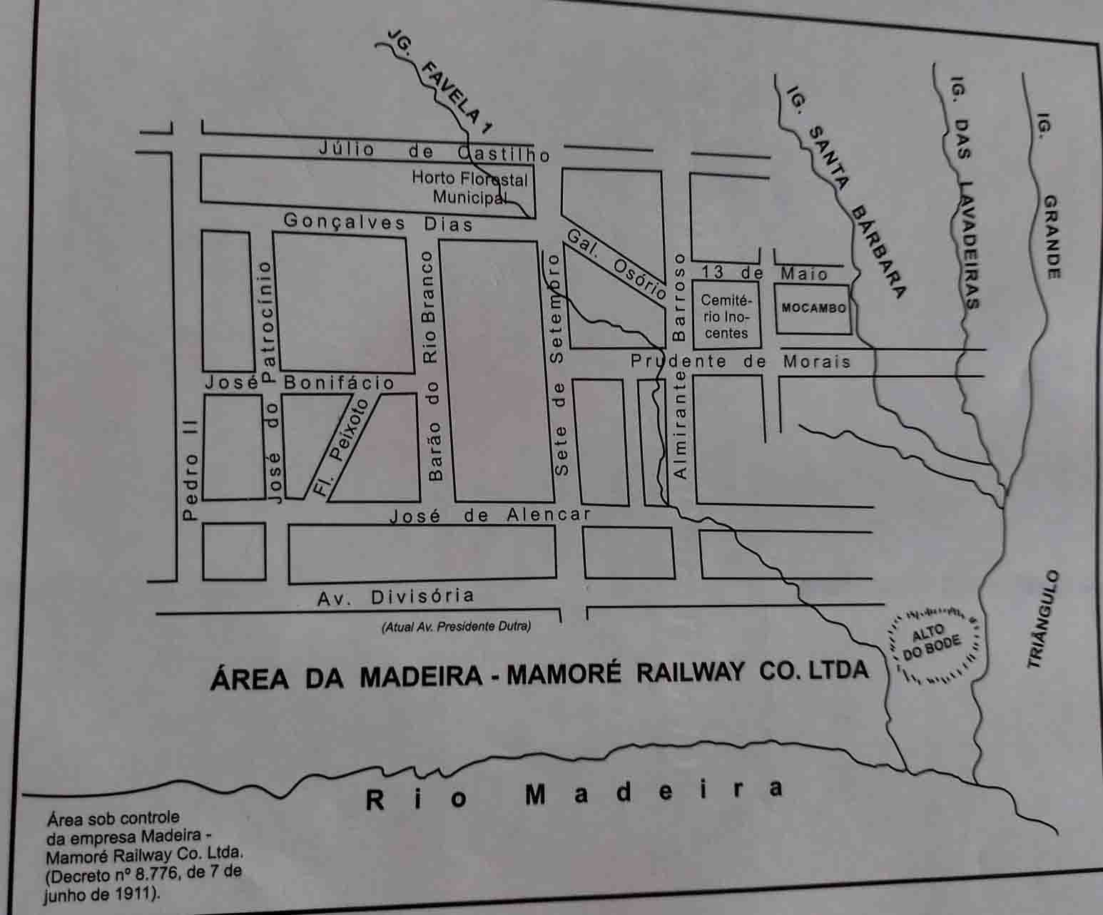 FOTO DO DIA: Porto Velho, início da década de 1920. Na parte de baixo, ocupando desde a margem do Rio Madeira até a Avenida Divisória, depois Avenida Presidente Dutra, a área ocupada e onde estavam todas as estruturas da empresa Madeira-Mamoré Railoway Co. Ltda, conforme o Decreto 8.776, de 7 de junho de 1911, gestora da ferrovia Madeira-Mamoré, era chamada “Porto Velho dos Americanos”. A partir daí o croqui do mapa feito pelo professor e historiador Abnael Machado de Lima, mostrando a “Porto Velho dos Brasileiros”, com destaque ao “Horto Florestal”, entre as ruas Júlio de Castilho e Gonçalves Dias. O historiador Francisco Matias acrescentava que bastava a quem tivesse cometido um crime em um dos lados e passasse para o outro não havia como prender o infrator.