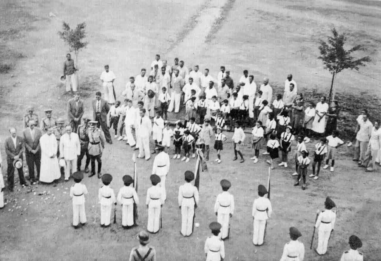 FOTO DO DIA: Em 1940 o presidente Getúlio Vargas chegou a Porto Velho para uma visita de três horas, e ficou quase 72 horas, o tempo todo preenchido por desfiles de trabalhadores, de escolares, de militares, visita à área de construção da BR, KM 8 a partir de Porto Velho, casa de um colono onde tomou cafezinho e se informou sobre como abrir um ouriço de castanha, participou de reuniões incluindo com o governador do Acre, que ele mandou buscar numa avioneta (monomotor), deu entrevistas para o repórter de uma revista norte-americana que acompanhava a visita do presidente à Amazônia, inaugurou o prédio do colégio Barão do Solimões, construído pela Ferrovia Madeira-Mamoré. Numa manhã foi levado a visitar o colégio salesiano, onde foi recebido por um contingente de estudantes, inclusive a Guarda Bandeira, todos em uniforme de gala. Na foto, com todos assessores que o acompanhavam na viagem, o padre diretor ao lado de Getúlio Vargas e, entre os dois, o capitão Aluízio Ferreira, então diretor-geral da Madeira-Mamoré. (F. acervo Anísio Goraieb, cedida a Lúcio Albuquerque)