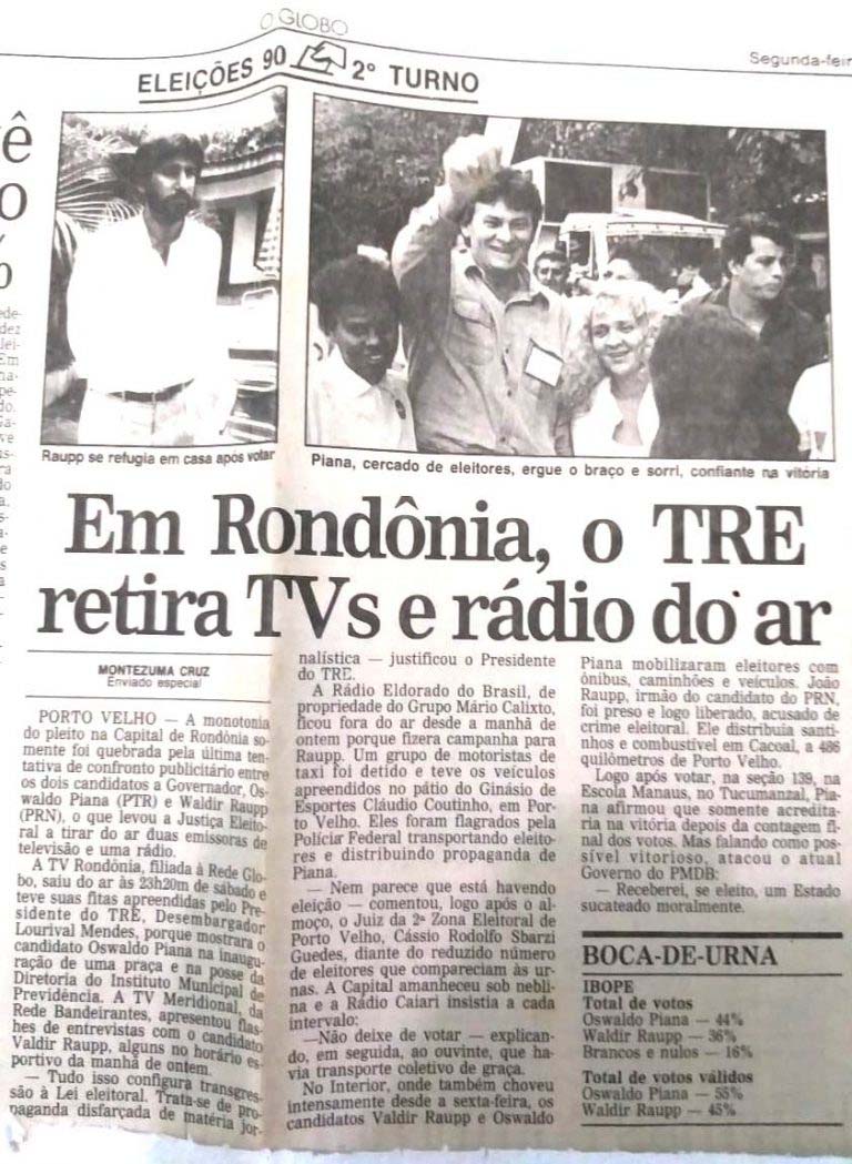 FOTO DO DIA: Campanha eleitoral de 1990, 2º turno. Na véspera da votação, segundo o Ibope, o candidato Osvaldo Piana contava 46% das intenções de voto e o adversário Valdir Raupp 36%. Foi quando o Tribunal Regional Eleitoral suspendeu as apresentações dos dois candidatos, na TV-Rondônia, na TV Meridional e na Rádio Eldorado (atual Boas Novas), sob acusações de infringências à legislação, conforme registrou o jornalista Montezuma Cruz ao jornal O Globo. Ao final Piana venceu, tornando-se o primeiro, e até agora o único, desde a criação do Território em 1943 e do Estado, em 1981, “filho da terra” a governar Rondônia. (F. Acervo Rondônia Minha Querida Rondônia)