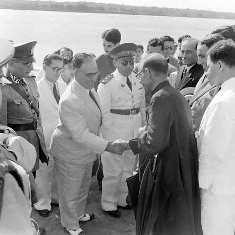 FOTO DO DIA: Terça-feira, 24 de agosto de 1954. Como em todas cidades do país o clima em Porto Velho é de choro e acusações aos inimigos do presidente Getúlio Vargas que, como ouviram os poucos donos de aparelhos de rádio na cidade, havia se suicidado. Mesmo os que tinham rádio esperaram a confirmação via telégrafo da notícia, quando ficaram sabendo que a causa foram acusações feitas sob a liderança do jornalista Carlos Lacerda, inicialmente membro do Partido Comunista e da Aliança Nacional Libertadora (ANL), entidade ligada ao PCB, mas depois saíra do PCB, militando contra as reformas trabalhistas implementadas por Vargas. Em Porto Velho o suicídio de Vargas, que veio a cidade em 1940 quando decidiu criar o Território Federal, gerou protestos, acirrando a disputa entre os dois grupos políticos existentes, os “cutubas” adeptos do deputado federal Aluízio Ferreira e os “peles-curtas”, adeptos de Joaquim Rondon, que naquele ano ganhou a vaga de deputado federal. (F. Acervo Esron Menezes – Getúlio Vargas, ao lado de Aluízío Ferreira, cumprimenta o padre diretor do colégio Dom Bosco)