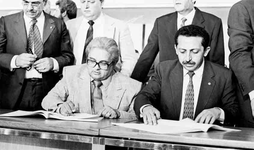 FOTO DO DIA: À esquerda, escrevendo, Áureo Bringel de Melo, nascido em Porto Velho em 1924, ainda município do Amazonas, morou em criança em Guajará-Mirim, então pertencente a Mato Grosso. Áureo Melo foi o deputado federal (AM) autor do projeto de lei que mudou de “Guaporé” para “Rondônia” o nome do futuro Estado. Segundo Abnael Machado de Lima a minuta do projeto foi preparada pelo deputado federal e ex-governador do Território Joaquim Vicente Rondon, numa homenagem ao fato de Áureo ter nascido na região. Além de político, Áureo Bringel de Mello foi advogado, jornalista, poeta, contista, pintor deputado estadual, federal e senador pelo Amazonas. Faleceu em Brasília em 2015.