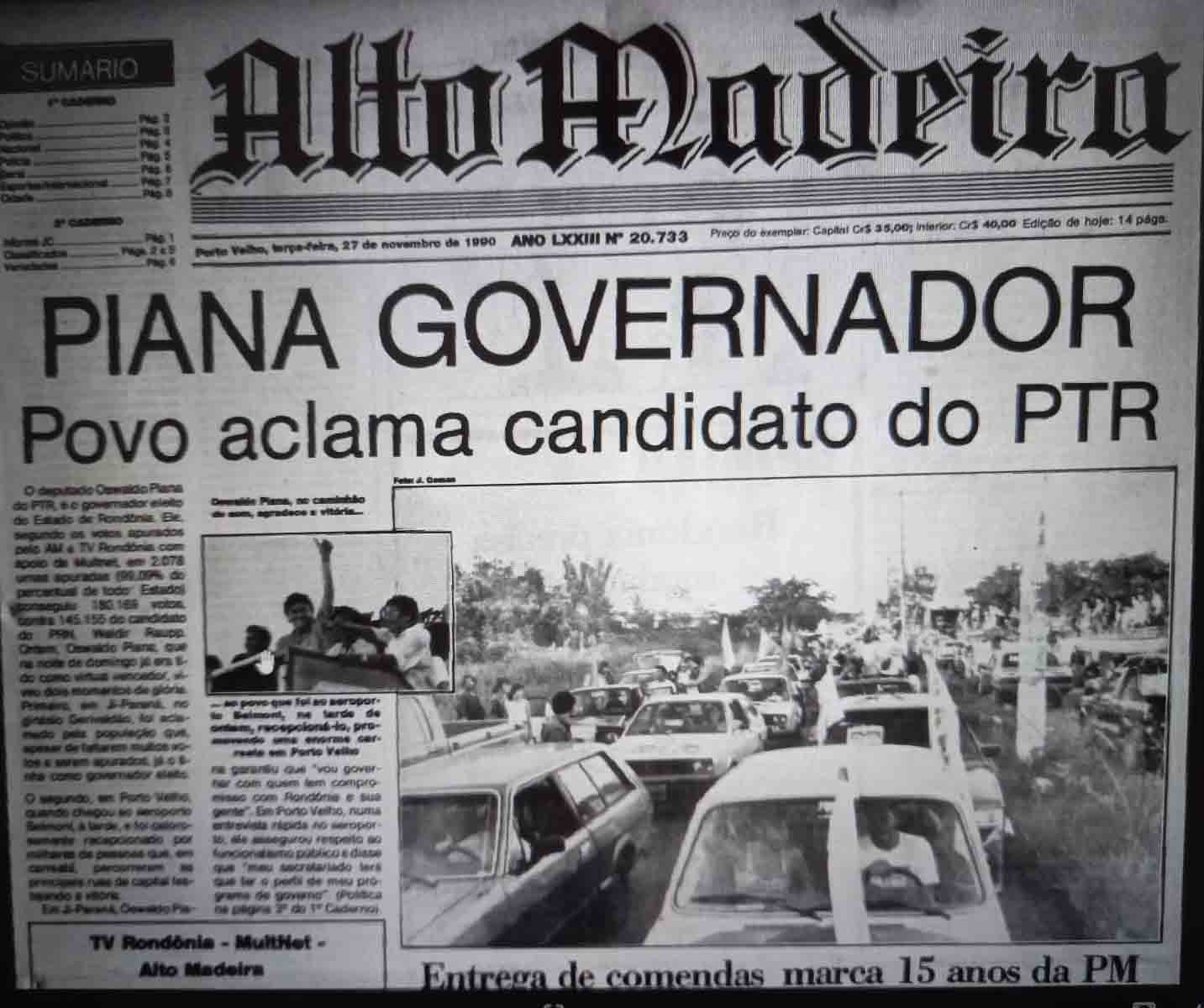 1990 – O médico Osvaldo Piana é o novo governador e o primeiro, desde 1943, nascido em Porto Velho. Ele acompanhou a parte final da contagem de votos em Ji-Paraná, onde a festa começou e teve uma recepção apoteótica ao chegar à capital.
