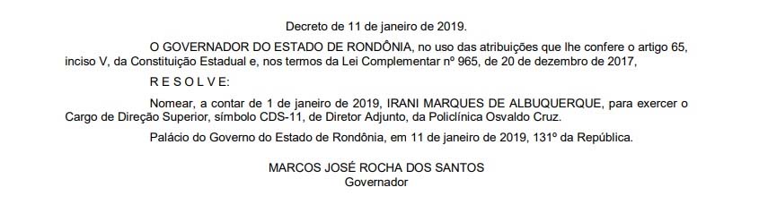 No último dia 11, Marcos Rocha nomeou também a ex-mulher, Irani Marques de Albuquerque como diretora adjunta da Policlínica Oswaldo Cruz