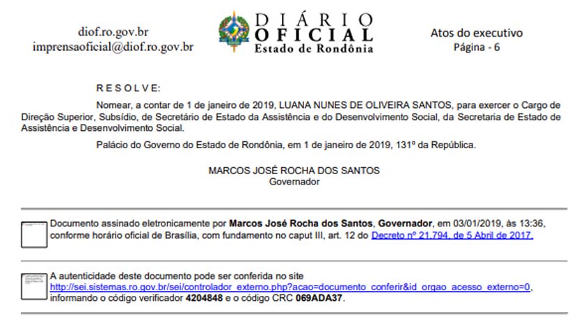 Afinadíssimo ideologicamente com Bolsonaro, no primeiro dia do ano o governador de Rondônia nomeou a esposa Luana Nunes de Oliveira Santos como Secretária de Estado da Assistência e do Desenvolvimento social.