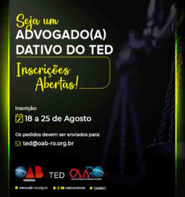 A partir desta quarta-feira (18) até o dia 25 de agosto, a OAB Rondônia recebe inscrição para cadastro de advogados dativos do Tribunal de Ética e Disciplina (TED). O pedido deve ser dirigido ao presidente da Seccional, através do e-mail: [email protected], acompanhado de currículo atualizado.