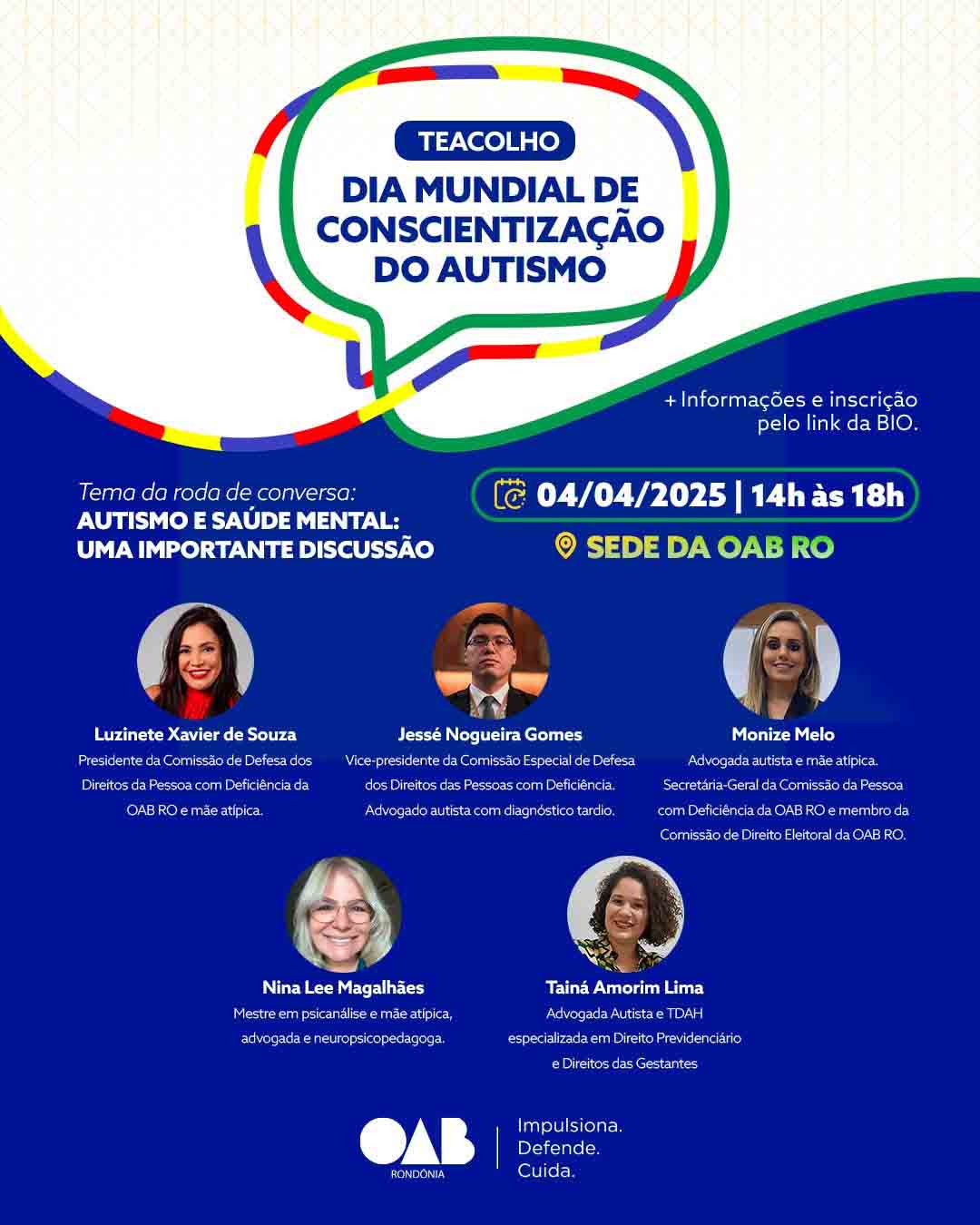 Nesta sexta-feira (04), a Comissão da OAB realiza, em Porto Velho, o TEACOLHO, um importante evento do Abril Azul – mês da conscientização sobre o autismo. A programação inclui uma palestra sobre saúde mental, um tema essencial, especialmente para quem cuida, além de uma roda de conversa com advogados autistas. Outras atrações do evento são serviços de massagem relaxante, maquiagem, sorteio de brindes e um coffee break.