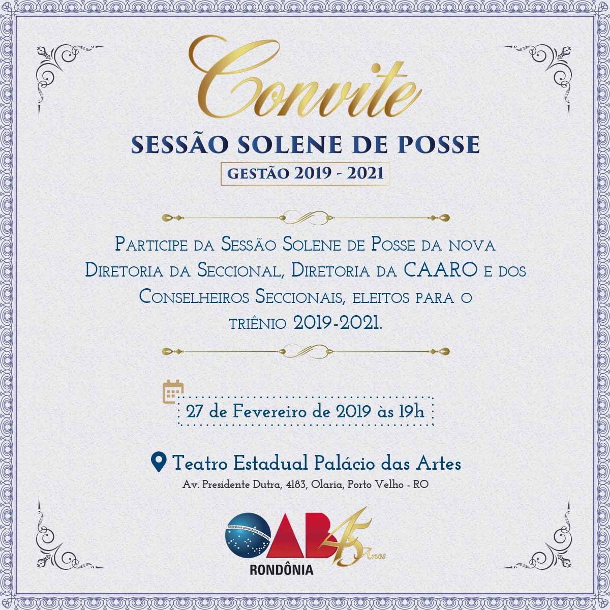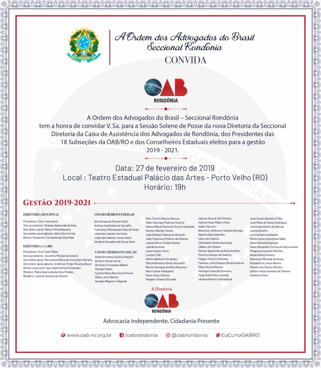 A Ordem dos Advogados do Brasil – Seccional Rondônia (OAB/RO) realiza no dia 27 de fevereiro (quarta-feira) sessão solene de posse da nova diretoria, conselheiros seccionais e diretoria da Caixa de Assistência dos Advogados do Estado de Rondônia (Caaro). O evento acontece no Teatro Palácio das Artes, em Porto Velho, a partir das 19h.
