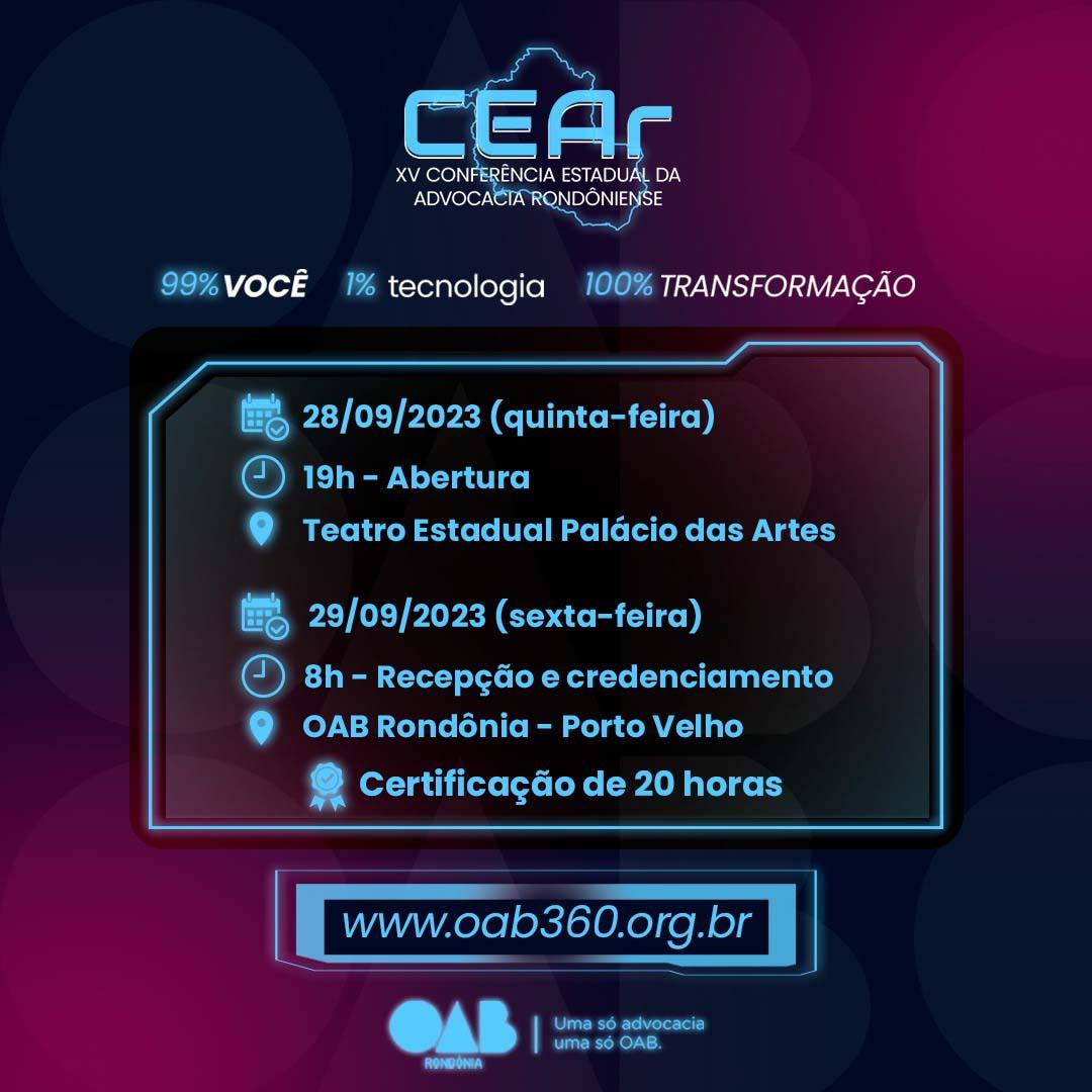 Reconhecendo essa mudança, a Ordem dos Advogados do Brasil - Seccional Rondônia (OABRO) realizará a XV Conferência Estadual da Advocacia Rondoniense (CEAR) onde abordará esta temática. O evento terá início no dia 28 de setembro no Teatro Palácio das Artes, com a presença do poeta Bráulio Bessa, que ministrará a palestra intitulada "Poesia Transforma". No dia seguinte, 29 de setembro, a CEAR será realizada na sede da OABRO, que se transformará em um grande laboratório tecnológico com palestras, oficinas e consultorias ocorrendo de forma simultânea.