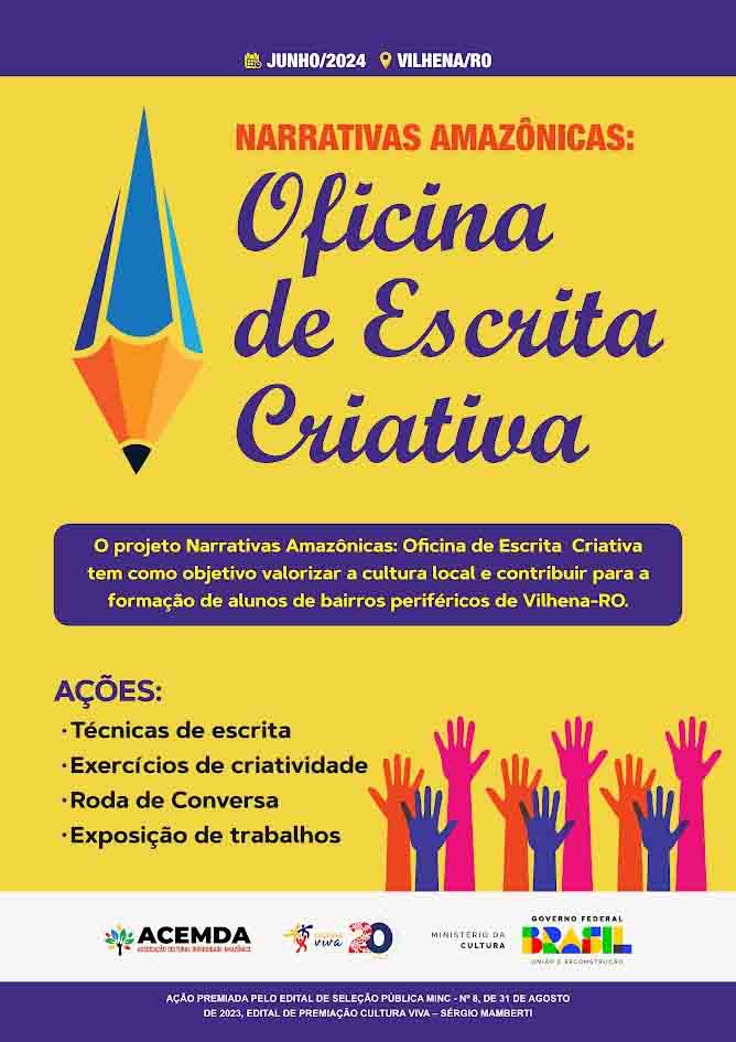 Neste mês de junho, Vilhena (RO) será palco de uma importante iniciativa cultural voltada para a valorização da cultura local e a formação de alunos de bairros periféricos. Trata-se do projeto “Narrativas Amazônicas: Oficina de Escrita Criativa”, que será coordenado pelo comunicador social vilhenense Pietro Paulo Di Amurin (Divino de Paulo de Amorim) e ministrado na escola pública estadual Shirlei Ceruti.