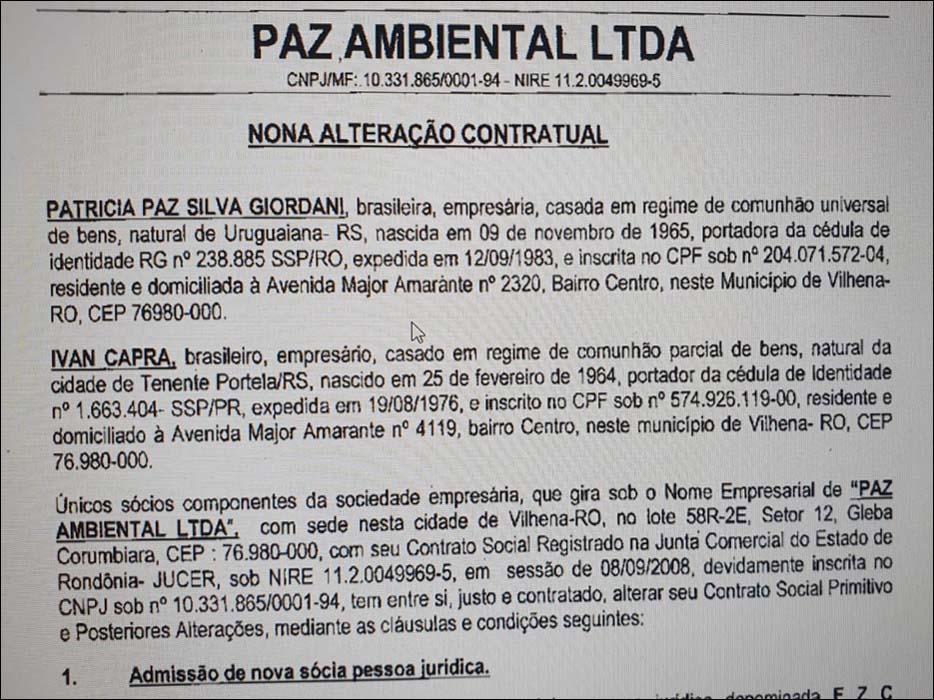 A Operação Monturo, deflagrada na manhã desta quinta-feira nas cidades de Rio Branco (AC) e Vilhena (RO) pela Polícia Federal atinge o presidente do Sicoob Credisul, Ivan Capra, sócio da EZC Participações S/A, uma das donas da empresa Paz Ambiental Ltda. Até a Nona Alteração Contratual registrada na Junta Comercial de Rondônia (Jucer), Alan Capra respondia como sócio junto com Patrícia Paz Silva Giordani da firma especialista em soluções ambientais.