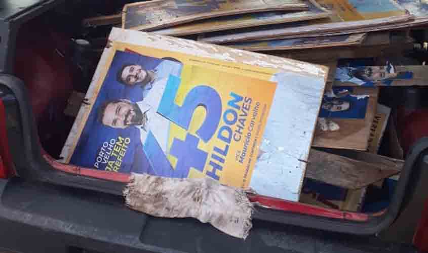 Colaboradores da campanha do prefeito Hildon Chaves, que concorre à reeleição com o número 45, estão percorrendo a cidade para retirar de canteiros centrais de avenidas propaganda irregular colocada pela oposição.