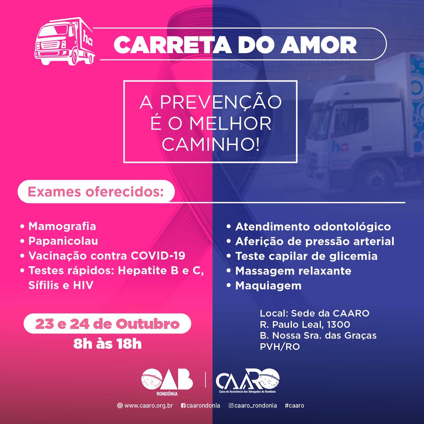 A Caixa de Assistência dos Advogados de Rondônia (CAARO) está novamente unindo forças com a Carreta de Prevenção do Hospital de Amor da Amazônia, para oferecer, de maneira gratuita, exames preventivos de mamografia e Papanicolau às advogadas.