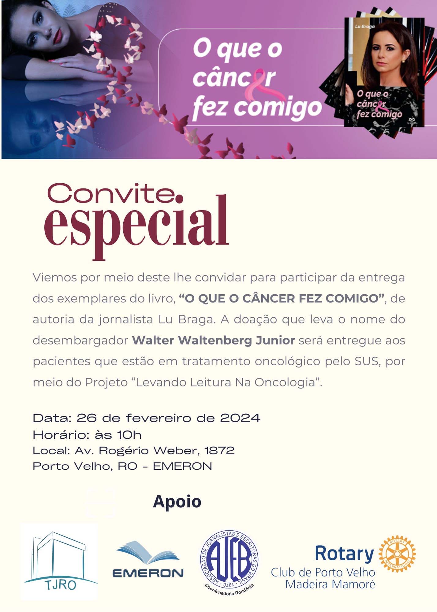 Com foco na prevenção e acolhimento, uma ação humanizada ocorrerá na Escola da Magistratura de Rondônia (EMERON), em Porto Velho, nesta segunda-feira (26). Pacientes que estão em tratamento contra o câncer pelo Sistema Único de Saúde (SUS), serão presenteados com um livro, “O que o câncer fez comigo”, da jornalista Lu Braga. A doação leva o nome do desembargador "Walter Waltenberg Junior", ex-presidente do Tribunal de Justiça de Rondônia (in memória).
