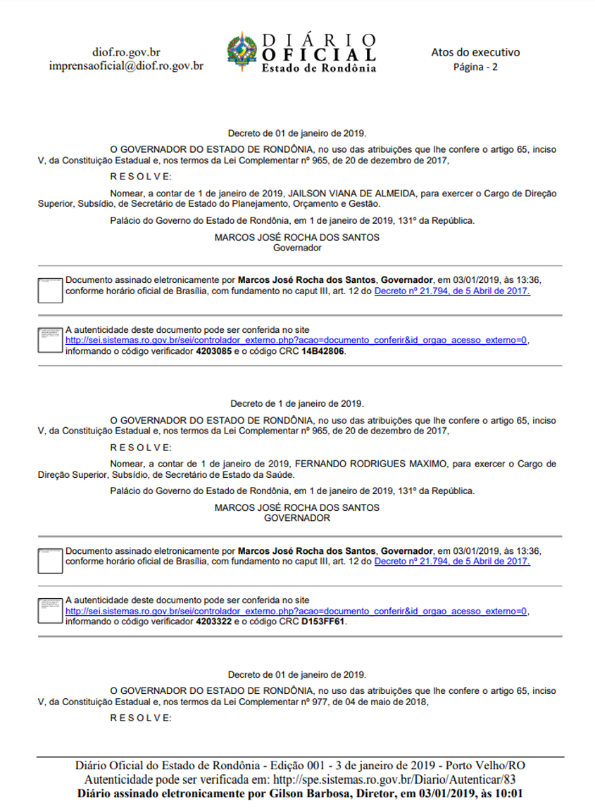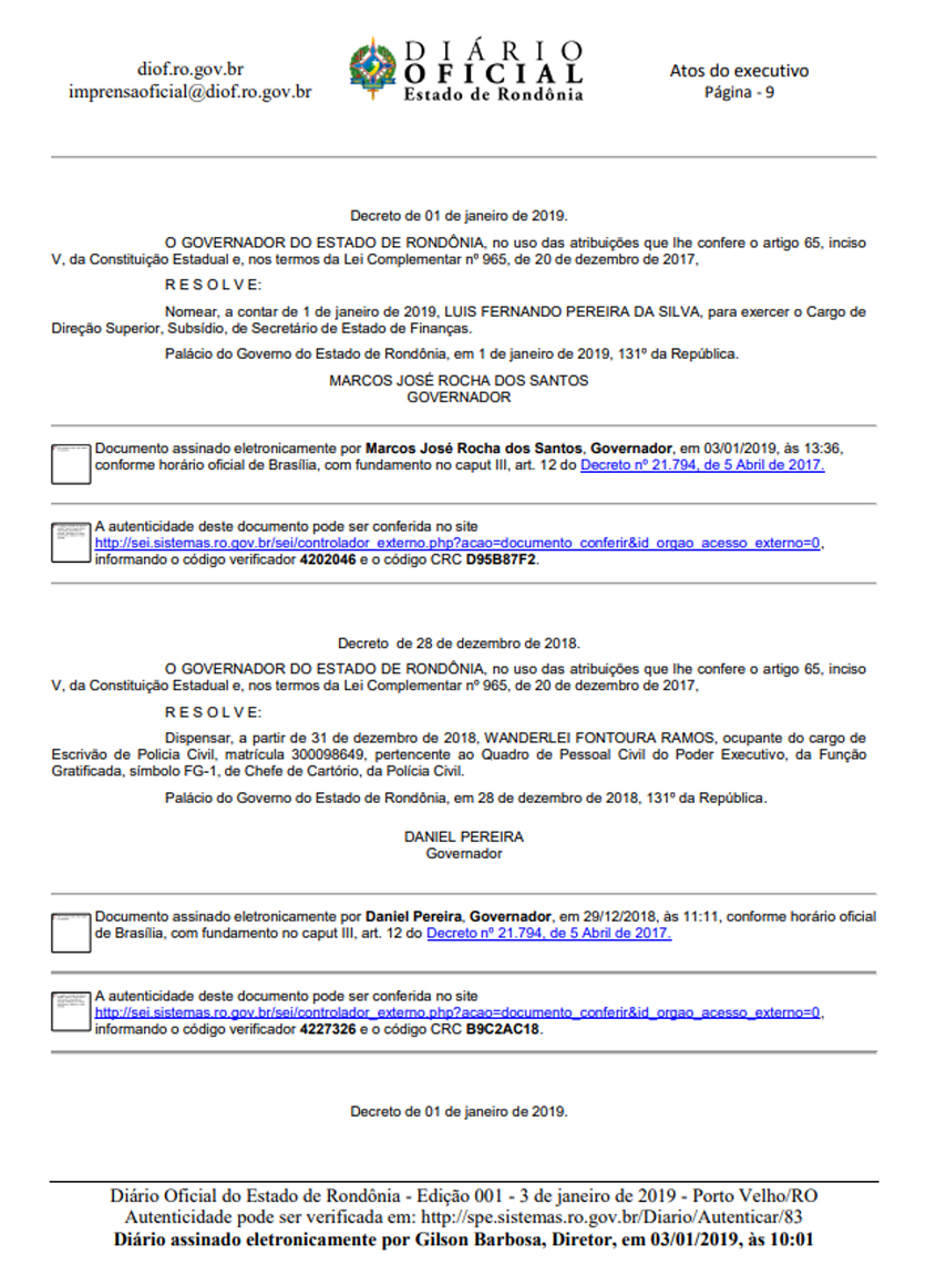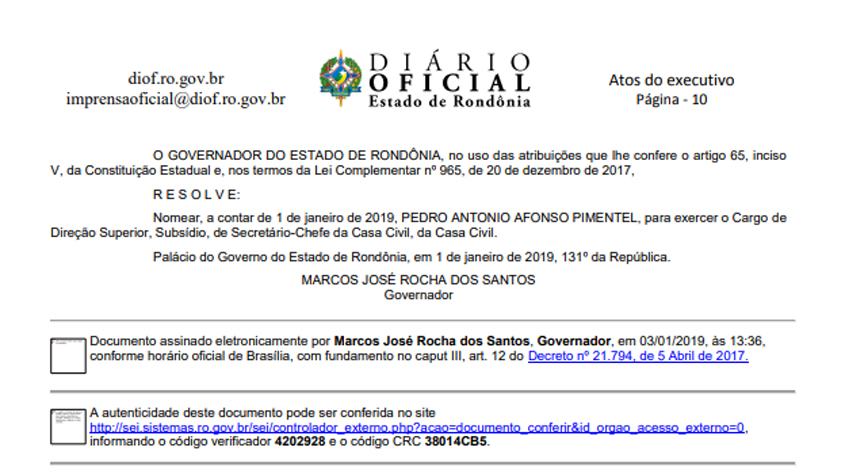 Para acobertar juridicamente despesas com viagem da mulher para posse de Bolsonaro, Coronel Rocha faz nomeações retroativas