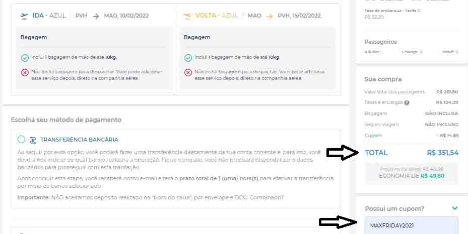 Para comprar os bilhetes aéreos com descontos especiais nos voos de Rondônia é preciso digitar o cupom promocional MAXFRIDAY2021