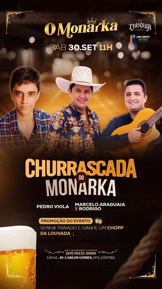 O garoto prodígio Pedro Violeiro, de São José dos Quatro Marcos, com sua voz potente e o seu carisma contagiante, vai ser atração especial da "Churrascada Do Monarka", deste sábado, dia 30, onde terá shows também da dupla Marcelo Araguaia e Rodrigo, na sequência, Alexandre Nery para fechar o evento gastronômico e músical da nova casa que é um novo conceito de entretenimento, lazer e gastronomia de alta qualidade.