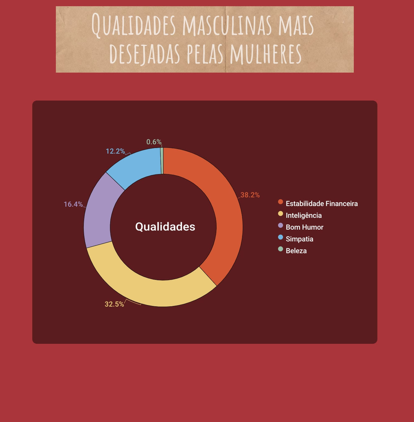 Em seguida, mencionada por 32,5% das usuárias, vem a inteligência. Característica que, muitas vezes, até poderia adquirir um peso negativo e intimidador. Homens muito inteligentes podem gerar insegurança nas parceiras que não conseguem acompanhar o raciocínio e muito menos manter uma conversa no mesmo nível. Não é machismo, o mesmo ocorre com mulheres inteligentes e parceiros nem tão capacitados neste quesito. As entrevistadas ressaltaram que a inteligência provoca admiração e não há relacionamento possível sem esse sentimento.