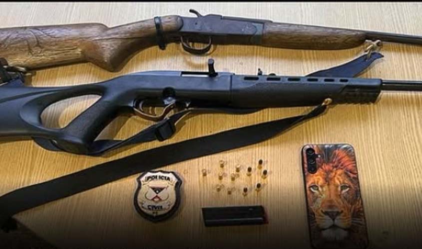 Durante a ação, os agentes apreenderam duas armas de fogo — um rifle calibre .22 e uma espingarda calibre 20 —, além de diversas munições, todas sem registro e sem autorização legal. Diante dos fatos, o suspeito também foi autuado em flagrante pelo crime de posse ilegal de arma de fogo. O investigado foi encaminhado ao Sistema Prisional, onde permanecerá à disposição da Justiça.