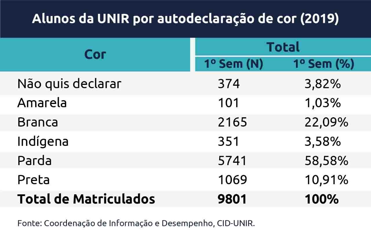 A reserva de vagas para cotistas é uma política nacional para instituições públicas de ensino superior, mas o modo como será implementada é definido por cada universidade. O que a UNIR tem feito é levar em consideração a composição populacional de Rondônia para então definir a distribuição das vagas. Atualmente 55% das vagas são reservadas para alguma das modalidades de cotas, o que inclui também pessoa com deficiências. No caso específico das cotas raciais, no primeiro semestre de 2019, segundos dados da Coordenação de Informação e Desempenho, CID, da UNIR, 73% dos 9,8 mil alunos matriculados em cursos de graduação se reconheciam como indígenas, pardos ou pretos.