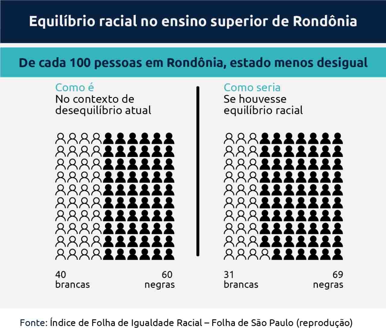 A Universidade Federal de Rondônia, UNIR, tem ampliado nos últimos anos as ações para garantir paridade de acesso às vagas ofertadas todos os anos nos cursos de graduação. Os reflexos destas ações têm se tornado evidentes, apesar de ser relativamente curto o tempo desde a implementação da política de cotas na instituição. As ações da UNIR são fator fundamental para que o Estado de Rondônia tenha sido recentemente apontado como o menos desigual no país quando se trata de igualdade de acesso ao ensino superior, o que foi destacado pela Folha de São Paulo através do Índice Folha de Equilíbrio Racial. A reitora da UNIR, Marcele Pereira, primeira negra a ocupar esta posição, afirma que “este tem sido um esforço contínuo da UNIR nos últimos anos, e temos a agora compromisso de manter o rumo e ampliar e melhorar as formas de acesso em tudo o que for possível.