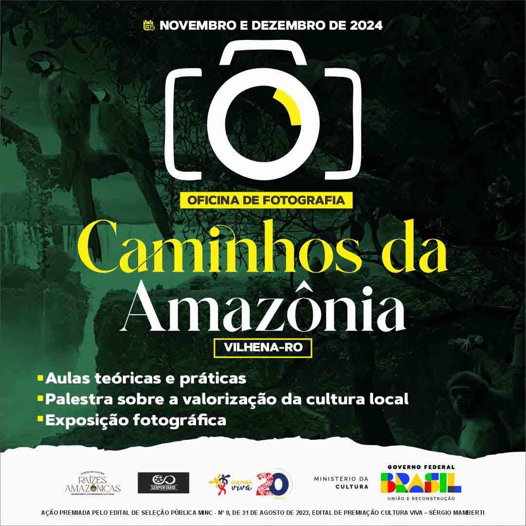 O Ponto de Cultura, Mídia Livre Serpentário Produções está oferecendo, entre os meses de novembro a dezembro em Vilhena (RO), a Oficina de Fotografia: Caminhos da Amazônia, que busca capacitar gratuitamente os participantes com aulas práticas e teóricas sobre a arte da fotografia. A iniciativa visa promover não apenas o conhecimento técnico, mas também a valorização da cultura e das belezas naturais da Amazônia, incentivando os alunos a desenvolverem um olhar artístico e sensível para a região.