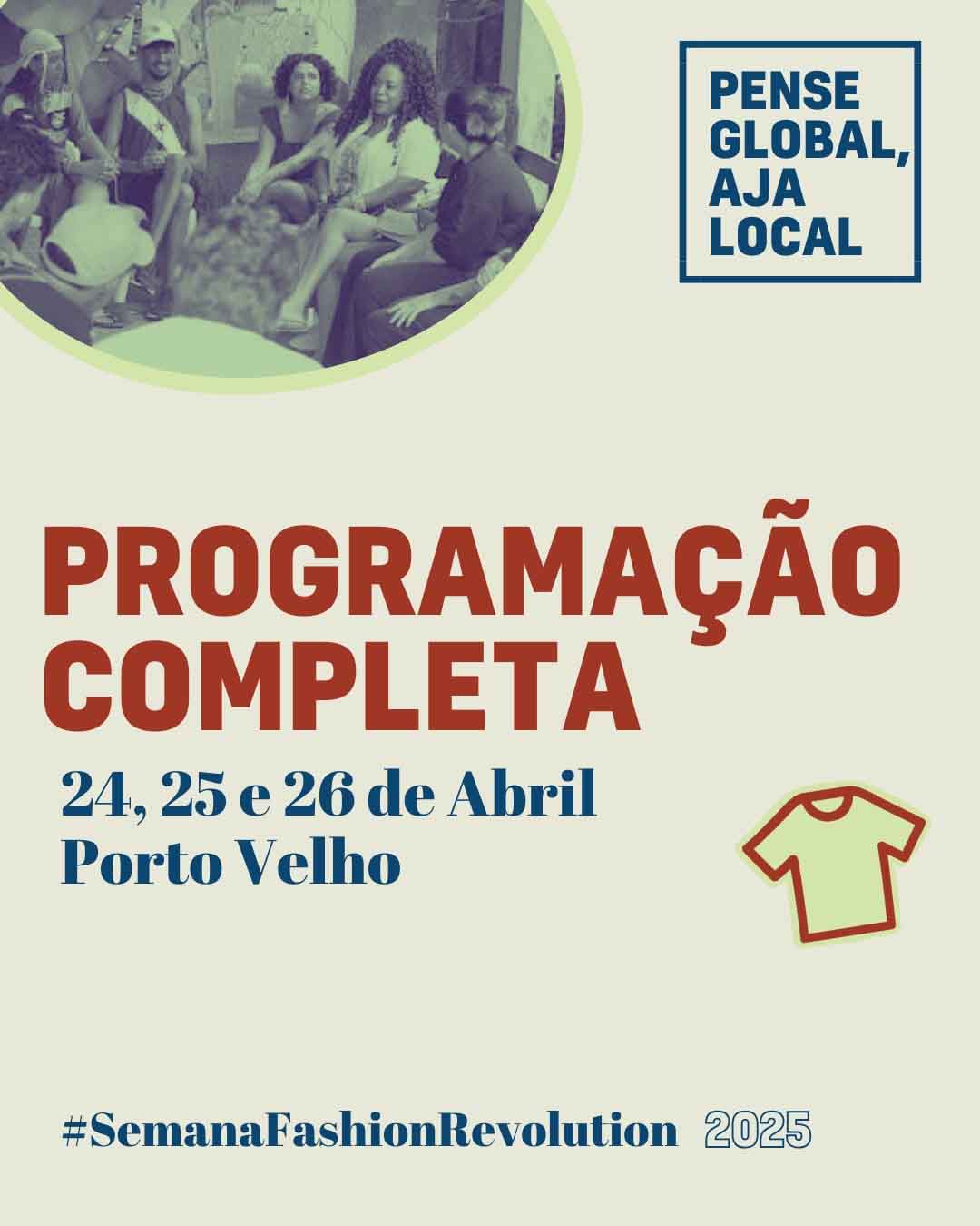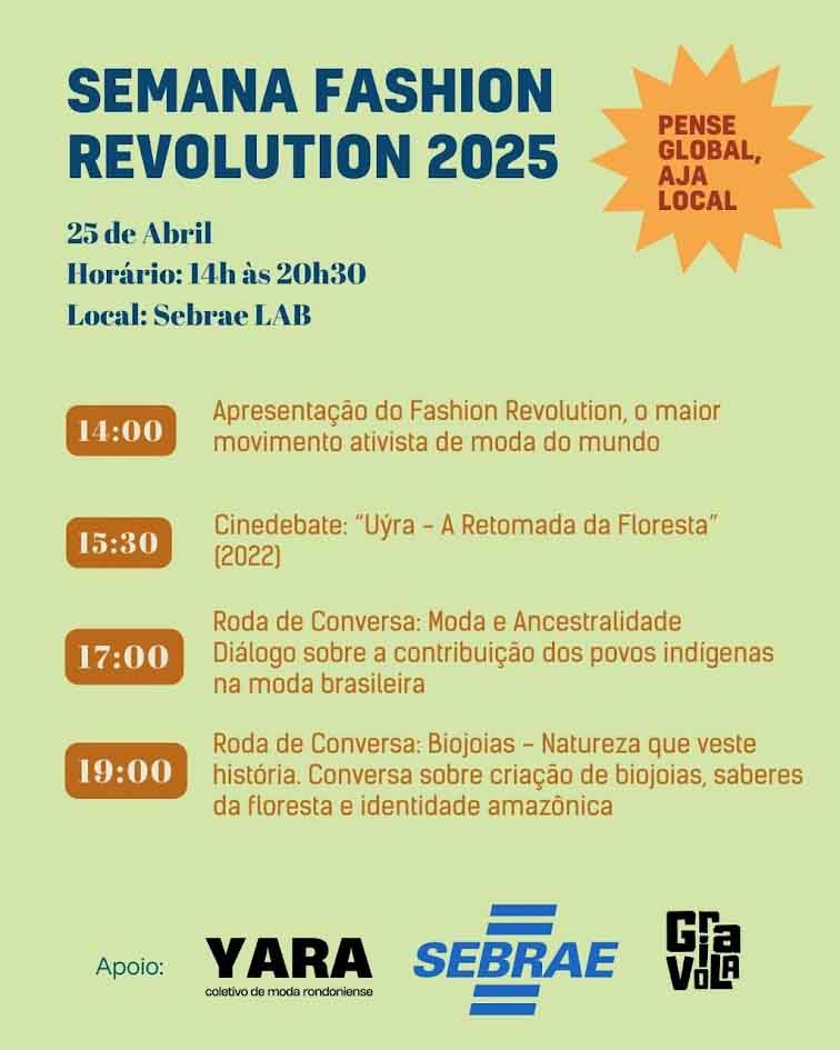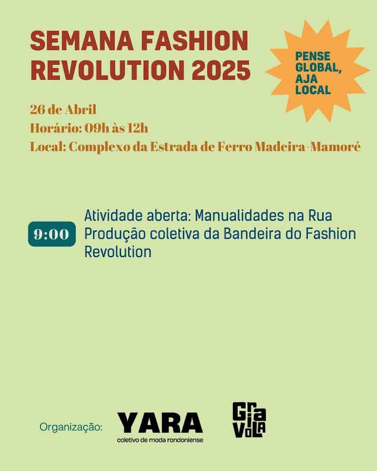 Porto Velho será sede da Semana Fashion Revolution 2025, de 24 a 26 de abril, com uma programação gratuita que convida o público a refletir sobre os impactos sociais e ambientais da moda. Realizado pelo Coletivo Yara, o evento integra o movimento global Fashion Revolution, surgido após o desabamento do edifício Rana Plaza, em Bangladesh, em 2013 — tragédia que revelou as condições precárias de trabalho na indústria têxtil.
