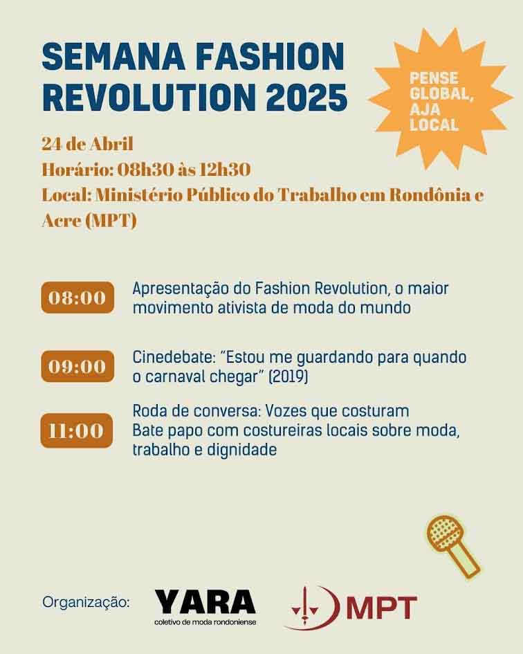 A proposta é fortalecer o debate sobre trabalho digno, moda consciente, ancestralidade e saberes tradicionais por meio de rodas de conversa, filmes e ações participativas. As atividades acontecem no Ministério Público do Trabalho em Rondônia e Acre (MPT), no Sebrae Lab e no Complexo da