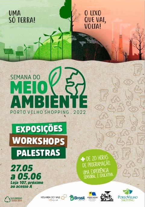 A partir da próxima sexta-feira (27), o Porto Velho Shopping irá sediar a Semana do Meio Ambiente, com programação até o dia 5 de junho de 2022. O evento, realizado em parceria com a Secretaria Municipal de Meio Ambiente (Sema), contará com área de exposição, workshops, oficinas e palestras em um espaço no Acesso A.