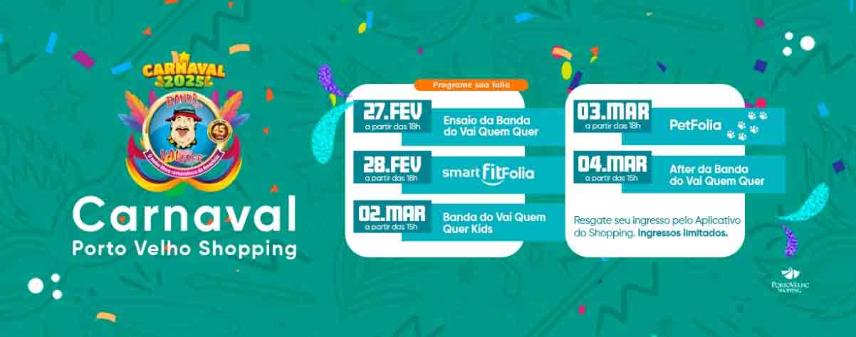 O Porto Velho Shopping preparou uma agenda especial para os foliões aproveitarem o Carnaval 2025. A programação ocorre no 1° Piso - Acesso A e conta com o apoio da Banda do Vai Quem Quer, maior bloco de Carnaval de rua da região Norte.