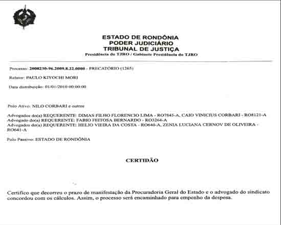 O Advogado Hélio Vieira e Zenia Cernov se manifestaram no processo concordando com os cálculos do setor de precatório e da Procuradoria Geral do Estado