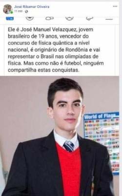 Mostrando que as notícias falsas enganam até mesmo portadores de diploma universitário (e Ribamar é professor de ensino superior), o educador publicou uma “corrente” de apoio ao “vencedor do concurso de física quântica José Manuel Velasquez”. Segundo a postagem, o jovem de 19 anos “é originário de Rondônia e vai representar o Brasil nas olimpíadas de física”.